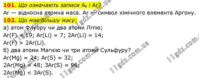 101. Що означають записи Аr і Ar? Аr — відносна атомна маса. Аr — символ хімічного елемента Аргону. 102. Що має більшу масу: а) атом Флуору чи два атоми Літію; Ar(F) = 19; Ar(Li) = 7; 2Ar(Li) = 14; Ar(F) > 2Ar(Li). б) два атоми Магнію чи три атоми Сульфуру? Ar(Mg) = 24; Ar(S) = 32; 2Ar(Mg) = 48; 3Ar(S) = 96; 2Ar(Mg) < 3Ar(S).