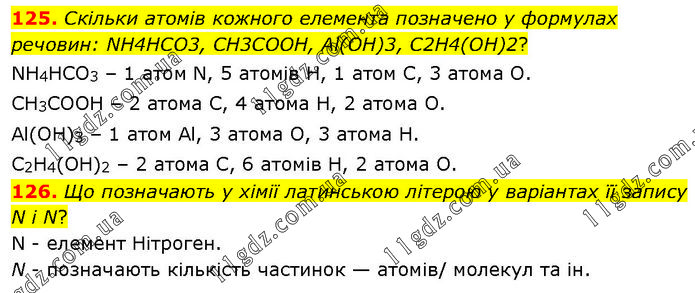 125. Скільки атомів кожного елемента позначено у формулах речовин: NH4HCO3, CH3COOH, Al(OH)3, C2H4(OH)2? NН4НСО3 – 1 атом N, 5 атомів Н, 1 атом С, 3 атома О. СН3СООН – 2 атома С, 4 атома Н, 2 атома О. Аl(ОН)3 – 1 атом Аl, 3 атома О, 3 атома Н. С2Н4(ОН)2 – 2 атома С, 6 атомів Н, 2 атома О. 126. Що позначають у хімії латинською літерою у варіантах її запису N і N? N - елемент Нітроген. N - позначають кількість частинок — атомів/ молекул та ін.