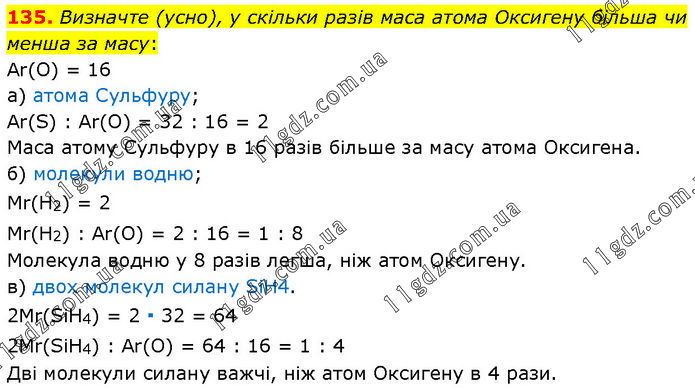Визначте (усно), у скільки разів маса атома Оксигену більша чи менша за масу: Аr(O) = 16 а) атома Сульфуру; Ar(S) : Аr(O) = 32 : 16 = 2 Маса атому Сульфуру в 16 разів більше за масу атома Оксигена. б) молекули водню; Мr(Н2) = 2 Мr(H2) : Аr(O) = 2 : 16 = 1 : 8 Молекула водню у 8 разів легша, ніж атом Оксигену. в) двох молекул силану SiH4. 2Мr(SiН4) = 2 ∙ 32 = 64 2Мr(SіН4) : Аr(O) = 64 : 16 = 1 : 4 Дві молекули силану важчі, ніж атом Оксигену в 4 рази.