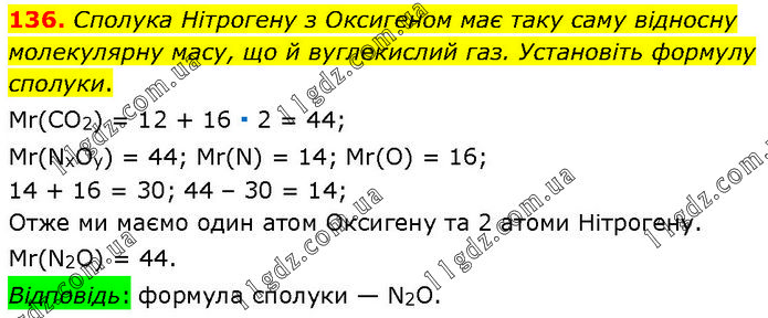 Сполука Нітрогену з Оксигеном має таку саму відносну молекулярну масу, що й вуглекислий газ. Установіть формулу сполуки. Мr(СO2) = 12 + 16 ∙ 2 = 44; Мr(NxOy) = 44; Мr(N) = 14; Мr(O) = 16; 14 + 16 = 30; 44 – 30 = 14; Отже ми маємо один атом Оксигену та 2 атоми Нітрогену. Мr(N2O) = 44. Відповідь: формула сполуки — N2O.
