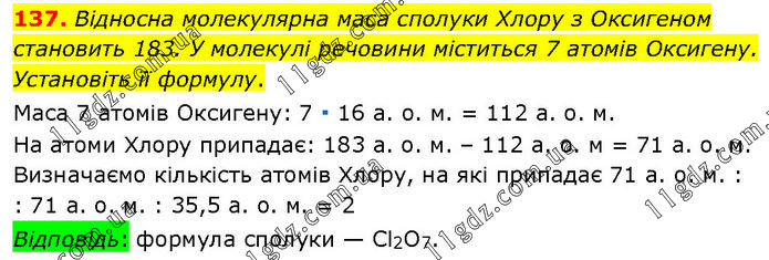 Відносна молекулярна маса сполуки Хлору з Оксигеном становить 183. У молекулі речовини міститься 7 атомів Оксигену. Установіть її формулу. Маса 7 атомів Оксигену: 7 ∙ 16 а. о. м. = 112 а. о. м. На атоми Хлору припадає: 183 а. о. м. – 112 а. о. м = 71 а. о. м. Визначаємо кількість атомів Хлору, на які припадає 71 а. о. м. : : 71 а. о. м. : 35,5 а. о. м. = 2 Відповідь: формула сполуки — Сl2O7.