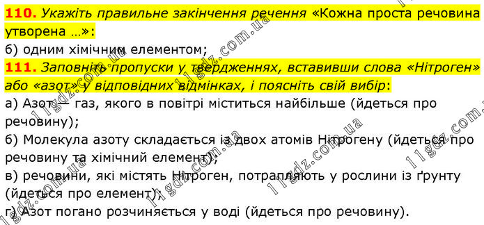 110. Укажіть правильне закінчення речення «Кожна проста речовина утворена …»: б) одним хімічним елементом; 111. Заповніть пропуски у твердженнях, вставивши слова «Нітроген» або «азот» у відповідних відмінках, і поясніть свій вибір: а) Азот — газ, якого в повітрі міститься найбільше (йдеться про речовину); б) Молекула азоту складається із двох атомів Нітрогену (йдеться про речовину та хімічний елемент); в) речовини, які містять Нітроген, потрапляють у рослини із ґрунту (йдеться про елемент); г) Азот погано розчиняється у воді (йдеться про речовину).