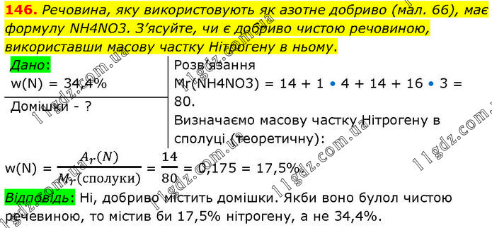 Речовина, яку використовують як азотне добриво (мал. 66), має формулу NH4NO3. З’ясуйте, чи є добриво чистою речовиною, використавши масову частку Нітрогену в ньому. Дано: w(N) = 34,4% Розв’язання Mr(NH4NO3) = 14 + 1 • 4 + 14 + 16 • 3 = 80. Визначаємо масову частку Нітрогену в сполуці (теоретичну): Домішки - ? w(N) = (A_r (N))/(M_r (сполуки)) = 14/80 = 0,175 = 17,5%. Відповідь: Ні, добриво містить домішки. Якби воно булол чистою речевиною, то містив би 17,5% нітрогену, а не 34,4%.