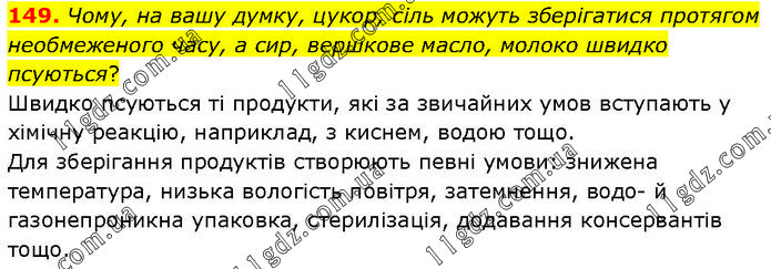 Чому, на вашу думку, цукор, сіль можуть зберігатися протягом необмеженого часу, а сир, вершкове масло, молоко швидко псуються? Швидко псуються ті продукти, які за звичайних умов вступають у хімічну реакцію, наприклад, з киснем, водою тощо. Для зберігання продуктів створюють певні умови: знижена температура, низька вологість повітря, затемнення, водо- й газонепроникна упаковка, стерилізація, додавання консервантів тощо.