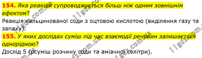 154. Яка реакція супроводжується більш ніж одним зовнішнім ефектом? Реакція кальцинованої соди з оцтовою кислотою (виділення газу та запаху). 155. У яких дослідах суміш під час взаємодії речовин залишається однорідною? Дослід 5 (рсуміш розчину соди та аміачної селітри).