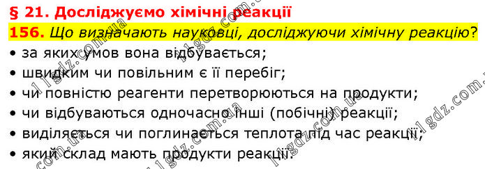 § 21. Досліджуємо хімічні реакції 156. Що визначають науковці, досліджуючи хімічну реакцію? • за яких умов вона відбувається; • швидким чи повільним є її перебіг; • чи повністю реагенти перетворюються на продукти; • чи відбуваються одночасно інші (побічні) реакції; • виділяється чи поглинається теплота під час реакції; • який склад мають продукти реакції.