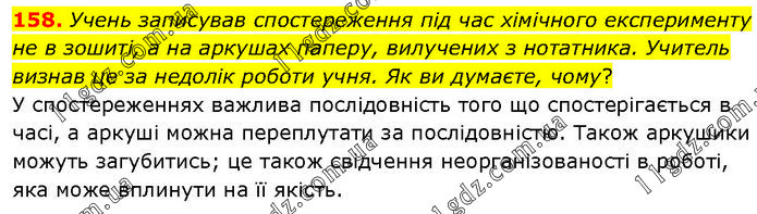 Учень записував спостереження під час хімічного експерименту не в зошиті, а на аркушах паперу, вилучених з нотатника. Учитель визнав це за недолік роботи учня. Як ви думаєте, чому? У спостереженнях важлива послідовність того що спостерігається в часі, а аркуші можна переплутати за послідовністю. Також аркушики можуть загубитись; це також свідчення неорганізованості в роботі, яка може вплинути на її якість.