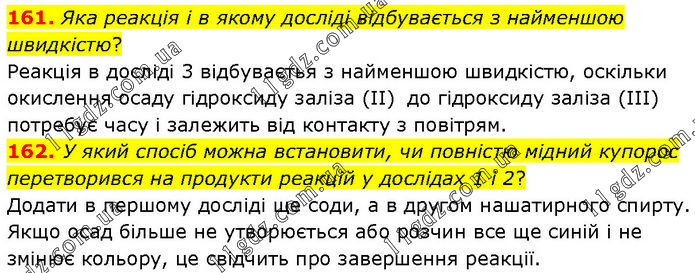 161. Яка реакція і в якому досліді відбувається з найменшою швидкістю? Реакція в досліді 3 відбуваєтья з найменшою швидкістю, оскільки окислення осаду гідроксиду заліза (ІІ) до гідроксиду заліза (III) потребує часу і залежить від контакту з повітрям. 162. У який спосіб можна встановити, чи повністю мідний купорос перетворився на продукти реакцій у дослідах 1 і 2? Додати в першому досліді ще соди, а в другом нашатирного спирту. Якщо осад більше не утворюється або розчин все ще синій і не змінює кольору, це свідчить про завершення реакції.