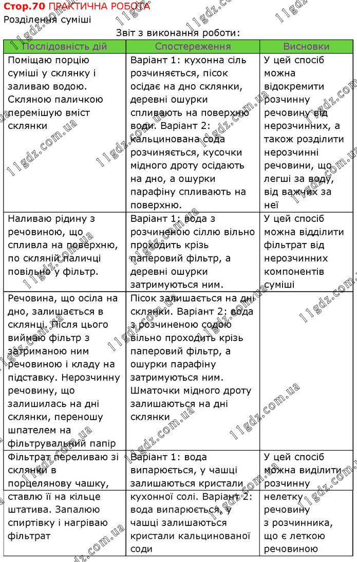 Стор.70 ПРАКТИЧНА РОБОТА Розділення суміші Звіт з виконання роботи: Послідовність дій Спостереження Висновки Поміщаю порцію суміші у склянку і заливаю водою. Скляною паличкою перемішую вміст склянки Варіант 1: кухонна сіль розчиняється, пісок осідає на дно склянки, деревні ошурки спливають на поверхню води. Варіант 2: кальцинована сода розчиняється, кусочки мідного дроту осідають на дно, а ошурки парафіну спливають на поверхню. У цей спосіб можна відокремити розчинну речовину від нерозчинних, а також розділити нерозчинні речовини, що легші за воду, від важчих за неї Наливаю рідину з речовиною, що спливла на поверхню, по скляній паличці повільно у фільтр. Варіант 1: вода з розчиненою сіллю вільно проходить крізь паперовий фільтр, а деревні ошурки затримуються ним. У цей спосіб можна відділити фільтрат від нерозчинних компонентів суміші Речовина, що осіла на дно, залишається в склянці. Після цього виймаю фільтр з затриманою ним речовиною і кладу на підставку. Нерозчинну речовину, що залишилась на дні склянки, переношу шпателем на фільтрувальний папір Пісок залишається на дні склянки. Варіант 2: вода з розчиненою содою вільно проходить крізь паперовий фільтр, а ошурки парафіну затримуються ним. Шматочки мідного дроту залишаються на дні склянки Фільтрат переливаю зі склянки в порцелянову чашку, ставлю її на кільце штатива. Запалюю спиртівку і нагріваю фільтрат Варіант 1: вода випарюється, у чашці залишаються кристали кухонної солі. Варіант 2: вода випарюється, у чашці залишаються кристали кальцинованої соди У цей спосіб можна виділити розчинну нелетку речовину з розчинника, що є леткою речовиною