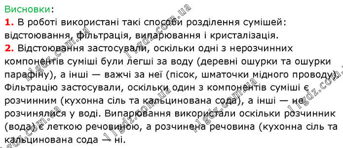 Висновки: 1. В роботі використані такі способи розділення сумішей: відстоювання, фільтрація, випарювання і кристалізація. 2. Відстоювання застосували, оскільки одні з нерозчинних компонентів суміші були легші за воду (деревні ошурки та ошурки парафіну), а інші — важчі за неї (пісок, шматочки мідного проводу). Фільтрацію застосували, оскільки один з компонентів суміші є розчинним (кухонна сіль та кальцинована сода), а інші — не розчинялися у воді. Випарювання використали оскільки розчинник (вода) є леткою речовиною, а розчинена речовина (кухонна сіль та кальцинована сода — ні.