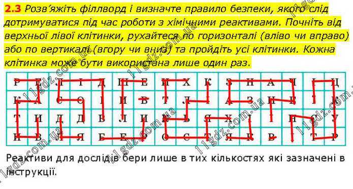 Розв’яжіть філлворд і визначте правило безпеки, якого слід дотримуватися під час роботи з хімічними реактивами. Почніть від верхньої лівої клітинки, рухайтеся по горизонталі (вліво чи вправо) або по вертикалі (вгору чи вниз) та пройдіть усі клітинки. Кожна клітинка може бути використана лише один раз. Реактиви для дослідів бери лише в тих кількостях які зазначені в інструкції.
