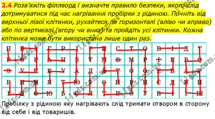 Розв’яжіть філлворд і визначте правило безпеки, якого слід дотримуватися під час нагрівання пробірки з рідиною. Почніть від верхньої лівої клітинки, рухайтеся по горизонталі (вліво чи вправо) або по вертикалі (вгору чи вниз) та пройдіть усі клітинки. Кожна клітинка може бути використана лише один раз. Пробілку з рідиною яку нагрівають слід тримати отвором в сторону від себе і від товаришів.