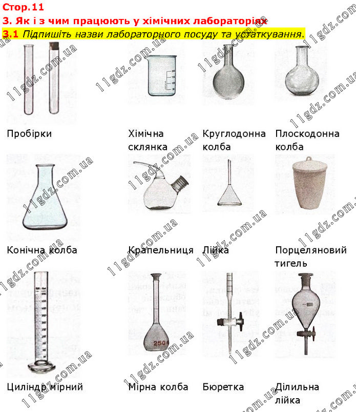 3. Як і з чим працюють у хімічних лабораторіях 3.1 Підпишіть назви лабораторного посуду та устаткування. Пробірки Хімічна склянка Круглодонна колба Плоскодонна колба Конічна колба Крапельниця Лійка Порцеляновий тигель Циліндр мірний Мірна колба Бюретка Ділильна лійка