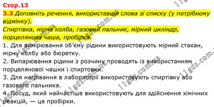 Доповніть речення, використавши слова зі списку (у потрібному відмінку). Спиртівка, мірна колба, газовий пальник, мірний циліндр, порцелянова чаша, пробірка. 1. Для вимірювання об’єму рідини використовують мірний стакан, мірну колбу або бюретку. 2. Випарювання рідини з розчину проводять із використанням порцелянової чашки і спиртовки. 3. Для нагрівання в лабораторії використовують спиртівку або газового пальника. 4. Посуд, який найчастіше використовують для здійснення хімічних реакцій, — це пробірки.