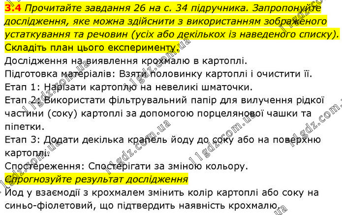 Прочитайте завдання 26 на с. 34 підручника. Запропонуйте дослідження, яке можна здійснити з використанням зображеного устаткування та речовин (усіх або декількох із наведеного списку). Складіть план цього експерименту. Дослідження на виявлення крохмалю в картоплі. Підготовка матеріалів: Взяти половинку картоплі і очистити її. Етап 1: Нарізати картоплю на невеликі шматочки. Етап 2: Використати фільтрувальний папір для вилучення рідкої частини (соку) картоплі за допомогою порцелянової чашки та піпетки. Етап 3: Додати декілька крапель йоду до соку або на поверхню картоплі. Спостереження: Спостерігати за зміною кольору. Спрогнозуйте результат дослідження Йод у взаємодії з крохмалем змінить колір картоплі або соку на синьо-фіолетовий, що підтвердить наявність крохмалю.