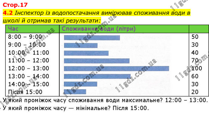 4.2 Інспектор із водопостачання вимірював споживання води в школі й отримав такі результати: У який проміжок часу споживання води максимальне? 12:00 – 13:00. У який проміжок часу — мінімальне? Після 15:00.