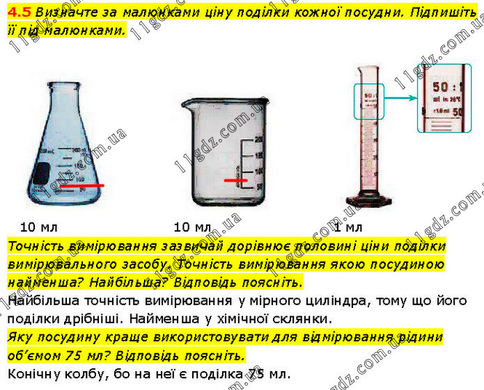 Визначте за малюнками ціну поділки кожної посудни. Підпишіть її під малюнками. 10 мл 10 мл 1 мл Точність вимірювання зазвичай дорівнює половині ціни поділки вимірювального засобу. Точність вимірювання якою посудиною найменша? Найбільша? Відповідь поясніть. Найбільша точність вимірювання у мірного циліндра, тому що його поділки дрібніші. Найменша у хімічної склянки. Яку посудину краще використовувати для відмірювання рідини об’ємом 75 мл? Відповідь поясніть. Конічну колбу, бо на неї є поділка 75 мл.