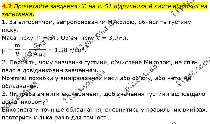 Прочитайте завдання 40 на с. 51 підручника й дайте відповіді на запитання. 1. За алгоритмом, запропонованим Миколою, обчисліть густину піску. Маса піску m = 5 г. Об'єм піску V = 3,9 мл. ρ = m/V = (5 г)/(3,9 мл) = 1,28 г/см3. 2. Поясніть, чому значення густини, обчислене Миколою, не спів-пало з довідниковим значенням. Можливі похибки у вимірюваннях маси або об’єму, або неточне обладнання. 3. Як треба змінити експеримент, щоб значення густини відповідало довідниковому? Використати точніше обладнання, впевнитись у правильних вимірах, повторити кілька разів для точності.