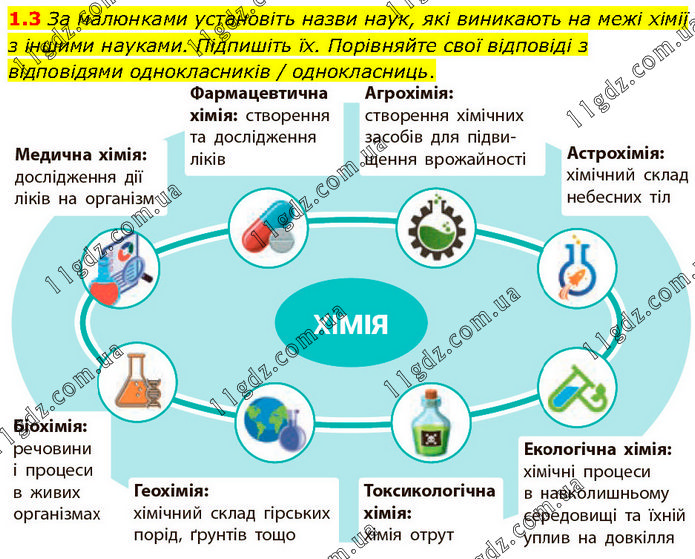 За малюнками установіть назви наук, які виникають на межі хімії з іншими науками. Підпишіть їх. Порівняйте свої відповіді з відповідями однокласників / однокласниць.