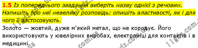Із попереднього завдання виберіть назву однієї з речовин. Напишіть про неї невелику розповідь: опишіть властивості, як і для чого її застосовують. Золото — жовтий, дуже м'який метал, що не кородує. Його використовують у ювелірних виробах, електроніці для контактів і в медицині.