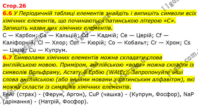 6.6 У Періодичній таблиці елементів знайдіть і випишіть символи всіх хімічних елементів, що починаються латинською літерою «С». Запишіть назви цих хімічних елементів. C — Карбон; Ca — Кальцій; Cd — Кадмій; Ce — Церій; Cf — Каліфорній; Cl — Хлор; Cm — Кюрій; Co — Кобальт; Cr — Хром; Cs — Цезій; Cu — Купрум. 6.7 Символами хімічних елементів можна складати слова англійською мовою. Приміром, англійською «вода» можна скласти із символів Вольфраму, Астату й Ербію (WAtEr). Запропонуйте інші слова англійською (або іншими мовами з латинським алфавітом), які можна скласти із символів хімічних елементів. FeAr (страх) - (Ферум, Аргон), CuP (чашка) - (Купрум, Фосфор), NaP (дрімання) - (Натрій, Фосфор).