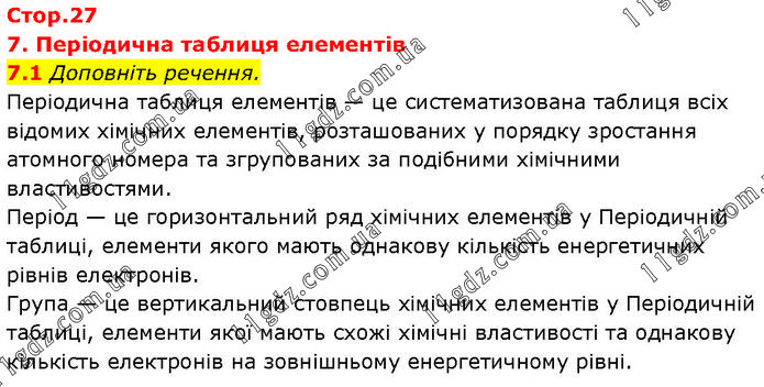 7. Періодична таблиця елементів 7.1 Доповніть речення. Періодична таблиця елементів — це систематизована таблиця всіх відомих хімічних елементів, розташованих у порядку зростання атомного номера та згрупованих за подібними хімічними властивостями. Період — це горизонтальний ряд хімічних елементів у Періодичній таблиці, елементи якого мають однакову кількість енергетичних рівнів електронів. Група — це вертикальний стовпець хімічних елементів у Періодичній таблиці, елементи якої мають схожі хімічні властивості та однакову кількість електронів на зовнішньому енергетичному рівні.