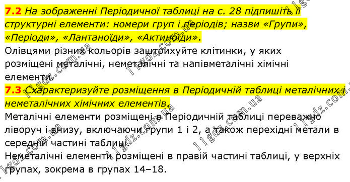 7.2 На зображенні Періодичної таблиці на с. 28 підпишіть її структурні елементи: номери груп і періодів; назви «Групи», «Періоди», «Лантаноїди», «Актиноїди». Олівцями різних кольорів заштрихуйте клітинки, у яких розміщені металічні, неметалічні та напівметалічні хімічні елементи. 7.3 Схарактеризуйте розміщення в Періодичній таблиці металічних і неметалічних хімічних елементів. Металічні елементи розміщені в Періодичній таблиці переважно ліворуч і внизу, включаючи групи 1 і 2, а також перехідні метали в середній частині таблиці. Неметалічні елементи розміщені в правій частині таблиці, у верхніх групах, зокрема в групах 14–18.