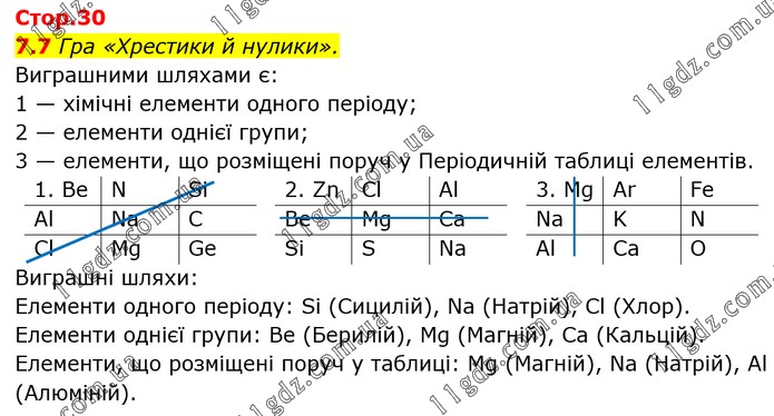 7.7 Гра «Хрестики й нулики». Виграшними шляхами є: 1 — хімічні елементи одного періоду; 2 — елементи однієї групи; 3 — елементи, що розміщені поруч у Періодичній таблиці елементів. Виграшні шляхи: Елементи одного періоду: Si (Сицилій), Na (Натрій), Cl (Хлор). Елементи однієї групи: Be (Берилій), Mg (Магній), Ca (Кальцій). Елементи, що розміщені поруч у таблиці: Mg (Магній), Na (Натрій), Al (Алюміній).