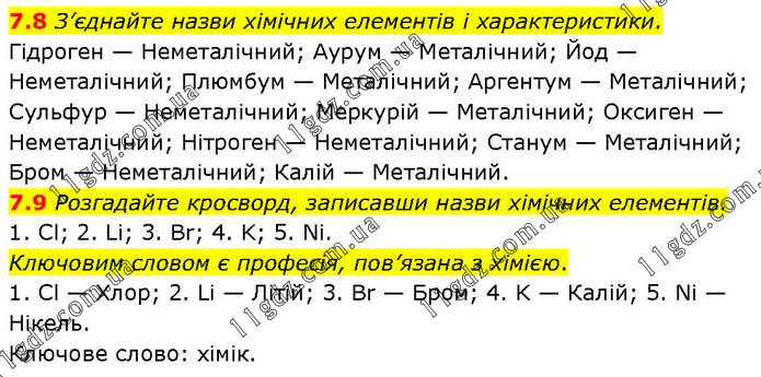7.8 З’єднайте назви хімічних елементів і характеристики. Гідроген — Неметалічний; Аурум — Металічний; Йод — Неметалічний; Плюмбум — Металічний; Аргентум — Металічний; Сульфур — Неметалічний; Меркурій — Металічний; Оксиген — Неметалічний; Нітроген — Неметалічний; Станум — Металічний; Бром — Неметалічний; Калій — Металічний. 7.9 Розгадайте кросворд, записавши назви хімічних елементів. 1. Cl; 2. Li; 3. Br; 4. K; 5. Ni. Ключовим словом є професія, пов’язана з хімією. 1. Cl — Хлор; 2. Li — Літій; 3. Br — Бром; 4. K — Калій; 5. Ni — Нікель. Ключове слово: хімік.
