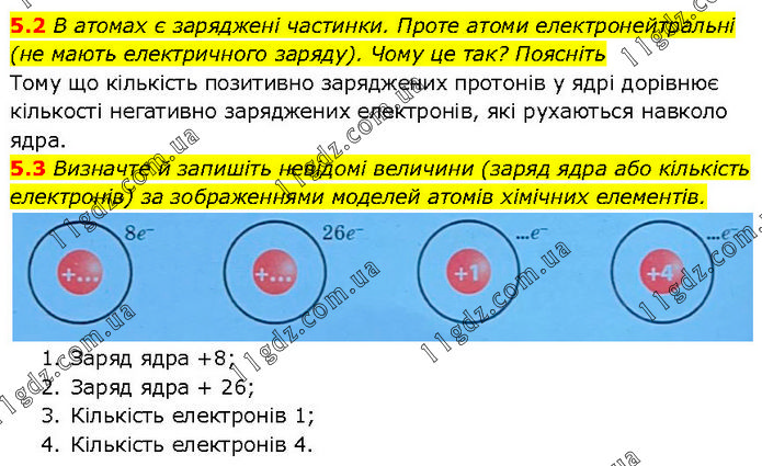 5.2 В атомах є заряджені частинки. Проте атоми електронейтральні (не мають електричного заряду). Чому це так? Поясніть Тому що кількість позитивно заряджених протонів у ядрі дорівнює кількості негативно заряджених електронів, які рухаються навколо ядра. 5.3 Визначте й запишіть невідомі величини (заряд ядра або кількість електронів) за зображеннями моделей атомів хімічних елементів. 1. Заряд ядра +8; 2. Заряд ядра + 26; 3. Кількість електронів 1; 4. Кількість електронів 4.