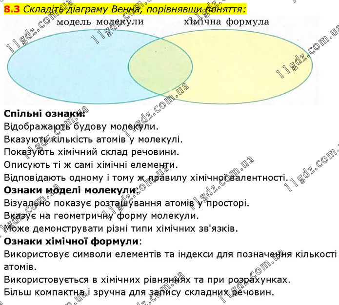 Складіть діаграму Венна, порівнявши поняття: Спільні ознаки: Відображають будову молекули. Вказують кількість атомів у молекулі. Показують хімічний склад речовини. Описують ті ж самі хімічні елементи. Відповідають одному і тому ж правилу хімічної валентності. Ознаки моделі молекули: Візуально показує розташування атомів у просторі. Вказує на геометричну форму молекули. Може демонструвати різні типи хімічних зв'язків. Ознаки хімічної формули: Використовує символи елементів та індекси для позначення кількості атомів. Використовується в хімічних рівняннях та при розрахунках. Більш компактна і зручна для запису складних речовин.