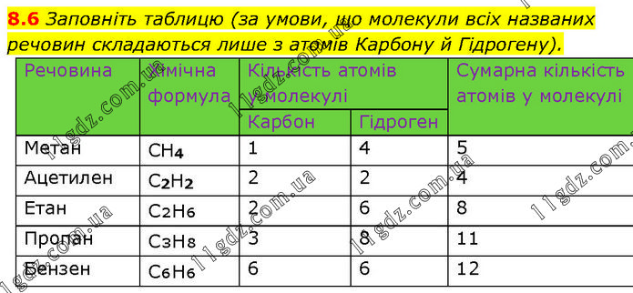 Заповніть таблицю (за умови, що молекули всіх названих речовин складаються лише з атомів Карбону й Гідрогену).
