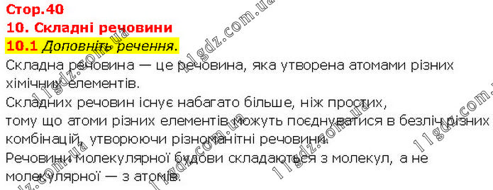 10. Складні речовини 10.1 Доповніть речення. Складна речовина — це речовина, яка утворена атомами різних хімічних елементів. Складних речовин існує набагато більше, ніж простих, тому що атоми різних елементів можуть поєднуватися в безліч різних комбінацій, утворюючи різноманітні речовини. Речовини молекулярної будови складаються з молекул, а не молекулярної — з атомів.