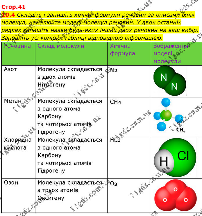Складіть і запишіть хімічні формули речовин за описами їхніх молекул, намалюйте моделі молекул речовин. У двох останніх рядках запишіть назви будь-яких інших двох речовин на ваш вибір. Заповніть усі комірки таблиці відповідною інформацією.