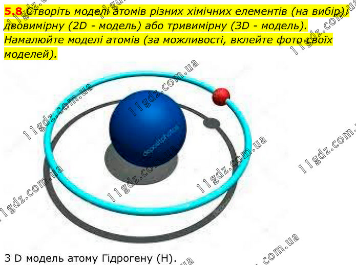 Створіть моделі атомів різних хімічних елементів (на вибір): двовимірну (2D - модель) або тривимірну (ЗD - модель). Намалюйте моделі атомів (за можливості, вклейте фото своїх моделей). 3 D модель атому Гідрогену (Н).
