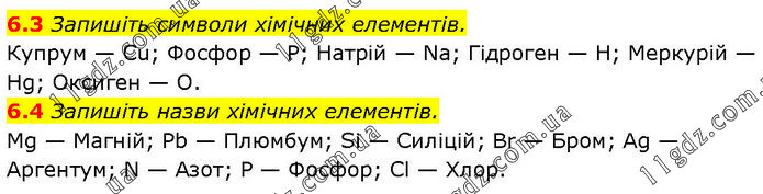 6.3 Запишіть символи хімічних елементів. Купрум — Cu; Фосфор — P; Натрій — Na; Гідроген — H; Меркурій — Hg; Оксиген — O. 6.4 Запишіть назви хімічних елементів. Mg — Магній; Pb — Плюмбум; Si — Силіцій; Br — Бром; Ag — Аргентум; N — Азот; P — Фосфор; Cl — Хлор.