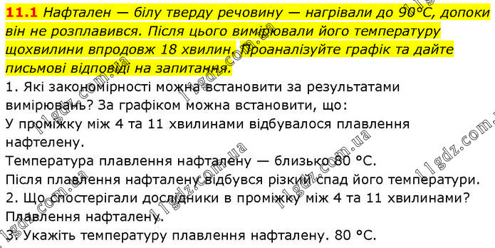 11.11 Нафтален — білу тверду речовину — нагрівали до 90°С, допоки він не розплавився. Після цього вимірювали його температуру щохвилини впродовж 18 хвилин. Проаналізуйте графік та дайте письмові відповіді на запитання. 1. Які закономірності можна встановити за результатами вимірювань? За графіком можна встановити, що: У проміжку між 4 та 11 хвилинами відбувалося плавлення нафтелену. Температура плавлення нафталену — близько 80 °C. Після плавлення нафталену відбувся різкий спад його температури. 2. Що спостерігали дослідники в проміжку між 4 та 11 хвилинами? Плавлення нафталену. 3. Укажіть температуру плавлення нафталену. 80 °C.