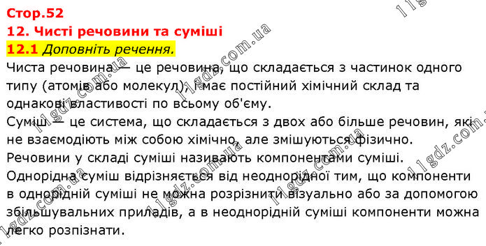 12. Чисті речовини та суміші 12.1 Доповніть речення. Чиста речовина — це речовина, що складається з частинок одного типу (атомів або молекул), і має постійний хімічний склад та однакові властивості по всьому об'єму. Суміш — це система, що складається з двох або більше речовин, які не взаємодіють між собою хімічно, але змішуються фізично. Речовини у складі суміші називають компонентами суміші. Однорідна суміш відрізняється від неоднорідної тим, що компоненти в однорідній суміші не можна розрізнити візуально або за допомогою збільшувальних приладів, а в неоднорідній суміші компоненти можна легко розпізнати.