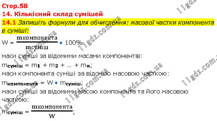 14. Кількісний склад сумішей 14.1 Запишіть формули для обчислення: масової частки компонента в суміші: W = mкомпонента/mсуміш • 100%. маси суміші за відомими масами компонентів: mсуміш = m1 + m2 + … + mn; маси компонента суміші за відомою масовою часткою: mкомпонента = W • mсуміш; маси суміші за відомими масою компонента та його масовою часткою: mсуміш = mкомпонента/W;
