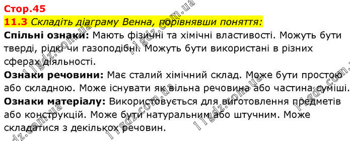 11.3 Складіть діаграму Венна, порівнявши поняття: Спільні ознаки: Мають фізичні та хімічні властивості. Можуть бути тверді, рідкі чи газоподібні. Можуть бути використані в різних сферах діяльності. Ознаки речовини: Має сталий хімічний склад. Може бути простою або складною. Може існувати як вільна речовина або частина суміші. Ознаки матеріалу: Використовується для виготовлення предметів або конструкцій. Може бути натуральним або штучним. Може складатися з декількох речовин.