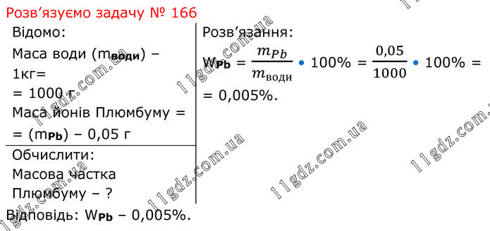 Розв’язуємо задачу № 166 Відомо: Маса води (mводи) – 1 кг = 1000 г; Маса йонів Плюмбуму = (mPb) – 0,05 г. Розв’язання: WPb = m_Pb/m_води • 100% = 0,05/1000 • 100% = 0,005%. Обчислити: Масова частка Плюмбуму – ? Відповідь: WPb – 0,005%.