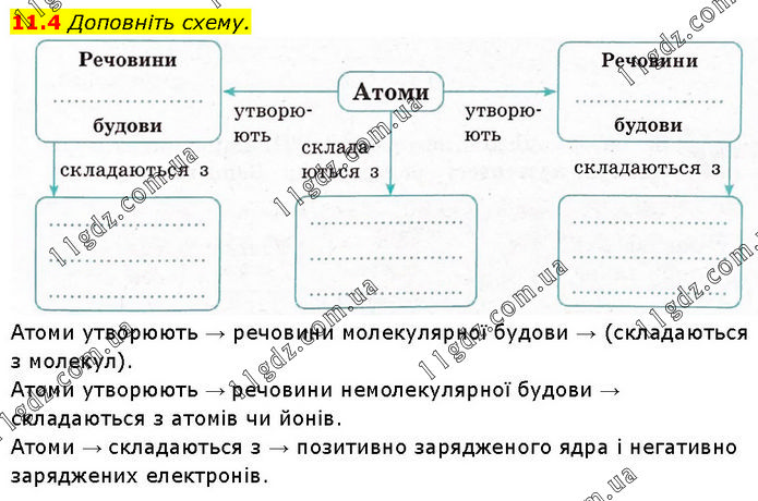 11.4 Доповніть схему. Атоми утворюють → речовини молекулярної будови → (складаються з молекул). Атоми утворюють → речовини немолекулярної будови → складаються з атомів чи йонів. Атоми → складаються з → позитивно зарядженого ядра і негативно заряджених електронів.