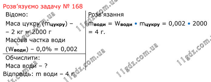Розв’язуємо задачу № 168 Відомо: Маса цукру (mцукру) – 2 кг = 2000 г; Масова частка води (Wводи) – 0,0% = 0,002. Розв’язання mводи = Wводи • mцукру = 0,002 • 2000 = 4 г. Обчислити: Маса води – ? Відповідь: m води – 4 г.