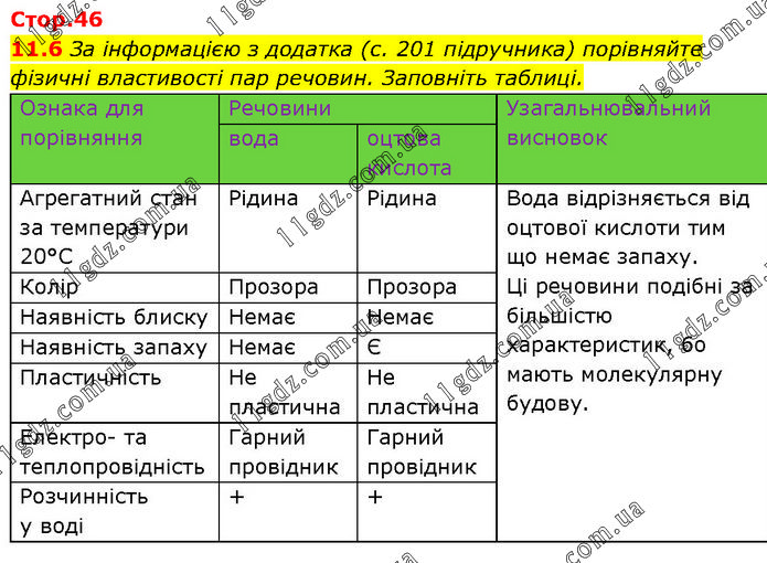 11.6 За інформацією з додатка (с. 201 підручника) порівняйте фізичні властивості пар речовин. Заповніть таблиці. Ознака для порівняння Речовини Узагальнювальний висновок вода оцтова кислота Агрегатний стан за температури 20°С Рідина Рідина Вода відрізняється від оцтової кислоти тим що немає запаху. Ці речовини подібні за більшістю характеристик, бо мають молекулярну будову.