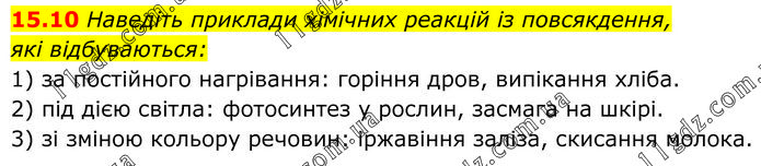 Наведіть приклади хімічних реакцій із повсякдення, які відбуваються: 1) за постійного нагрівання: горіння дров, випікання хліба. 2) під дією світла: фотосинтез у рослин, засмага на шкірі. 3) зі зміною кольору речовин: іржавіння заліза, скисання молока.
