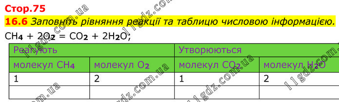 Заповніть рівняння реакції та таблицю числовою інформацією. CH4 + 2O2 = CO2 + 2H2O;