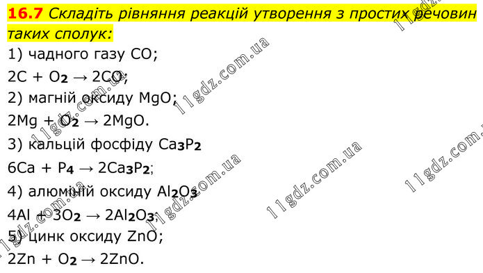 Складіть рівняння реакцій утворення з простих речовин таких сполук: 1) чадного газу CO; 2C + O2 → 2CO; 2) магній оксиду MgO; 2Mg + O2 → 2MgO. 3) кальцій фосфіду Ca3P2 6Ca + P4 → 2Ca3P2; 4) алюміній оксиду Al2O3 4Al + 3O2 → 2Al2O3; 5) цинк оксиду ZnO; 2Zn + O2 → 2ZnO.