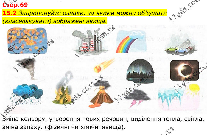 Запропонуйте ознаки, за якими можна об’єднати (класифікувати) зображені явища. Зміна кольору, утворення нових речовин, виділення тепла, світла, зміна запаху. (фізичні чи хімічні явища).