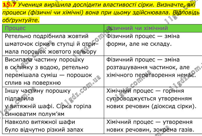 Учениця вирішила дослідити властивості сірки. Визначте, які процеси (фізичні чи хімічні) вона при цьому здійснювала. Відповідь обґрунтуйте. Процес Фізичний чи хімічний Ретельно подрібнила жовтий шматочок сірки в ступці й отри–мала порошок жовтого кольору Фізичний процес — зміна форми, але не складу. Висипала частину порошку в склянку з водою, ретельно перемішала суміш — порошок сплив на поверхню Фізичний процес — зміна розташування частинок, але хімічного перетворення немає. Іншу частину порошку підпалила у витяжній шафі. Сірка горіла синюватим полум’ям Хімічний процес — горіння супроводжується утворенням нових речовин (діоксид сірки). Навколо витяжної шафи було відчутно різкий запах Хімічний процес — утворення нових речовин, зокрема газів.