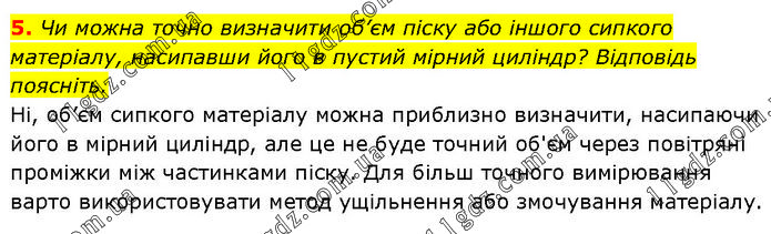 Чи можна точно визначити об’єм піску або іншого сипкого матеріалу, насипавши його в пустий мірний циліндр? Відповідь поясніть. Ні, об’єм сипкого матеріалу можна приблизно визначити, насипаючи його в мірний циліндр, але це не буде точний об'єм через повітряні проміжки між частинками піску. Для більш точного вимірювання варто використовувати метод ущільнення або змочування матеріалу.